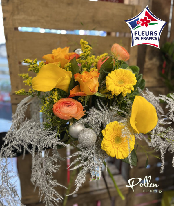 Bouquet mi-tiges aux couleurs chaudes jaune, orangé composé de fleurs de saison dans un esprit de fêtes.