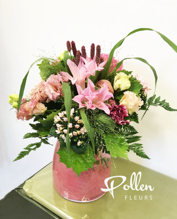Bouquet rond composé de roses et fleurs de saison dans les tons roses.