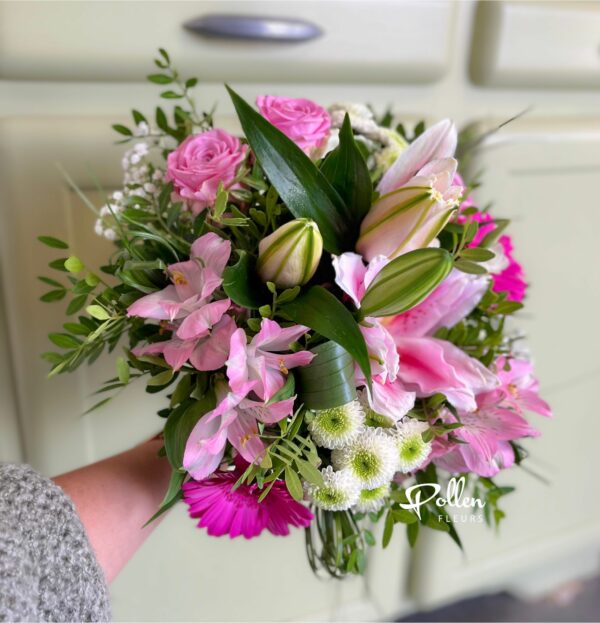 Bouquet rond aux teintes pastel roses et blanches, une composition florale élégante et délicate qui incarne la douceur et la tendresse.