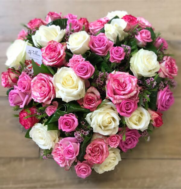 Élaborée avec des roses blanches et roses soigneusement piqués et hydratés, cette création florale apportera une touche de tendresse à la cérémonie funéraire.