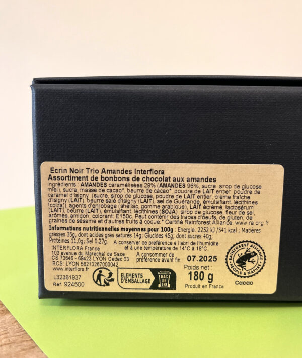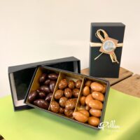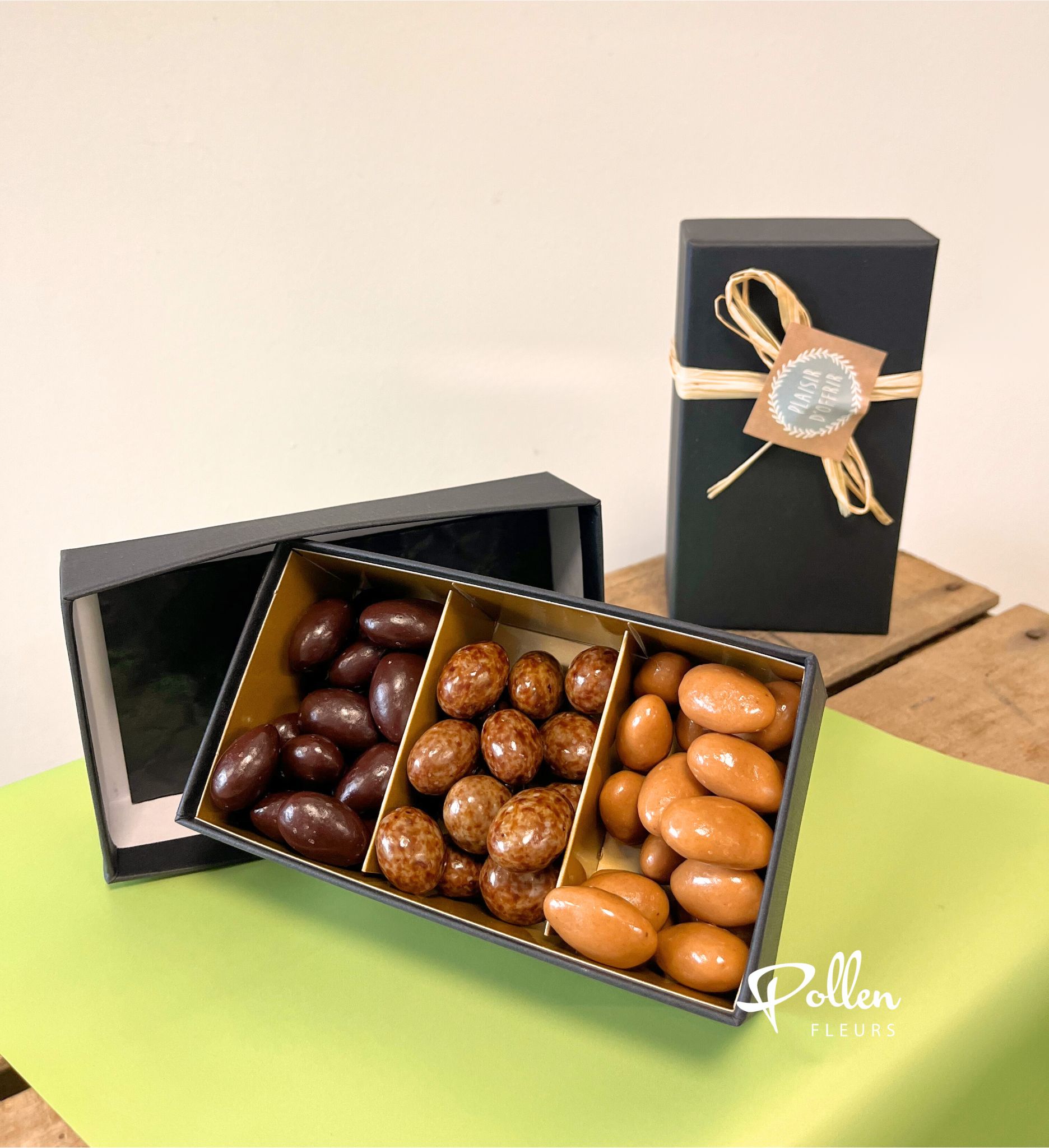 Ballotin d’amandes au chocolat : Amandes au caramel d’Isigny et fleur de sel, Amandes enrobées d’un chocolat blond, Amandes caramélisées au chocolat noir. 180g.