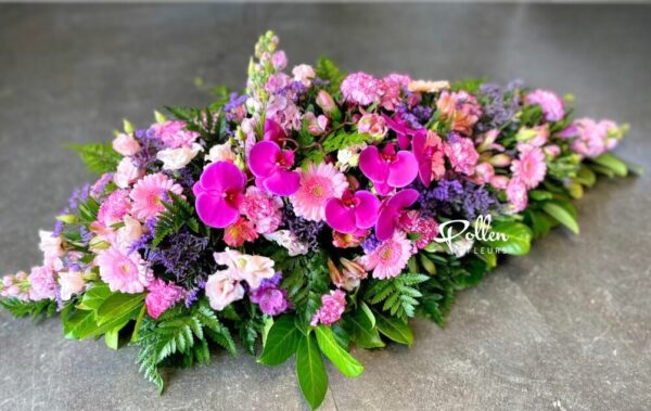 Dernier hommage empreint de tendresse avec ce dessus de cercueil aux teintes roses et parmes. Cette composition florale en longueur, piquée et hydratée, est conçue pour fleurir le cercueil avec élégance.