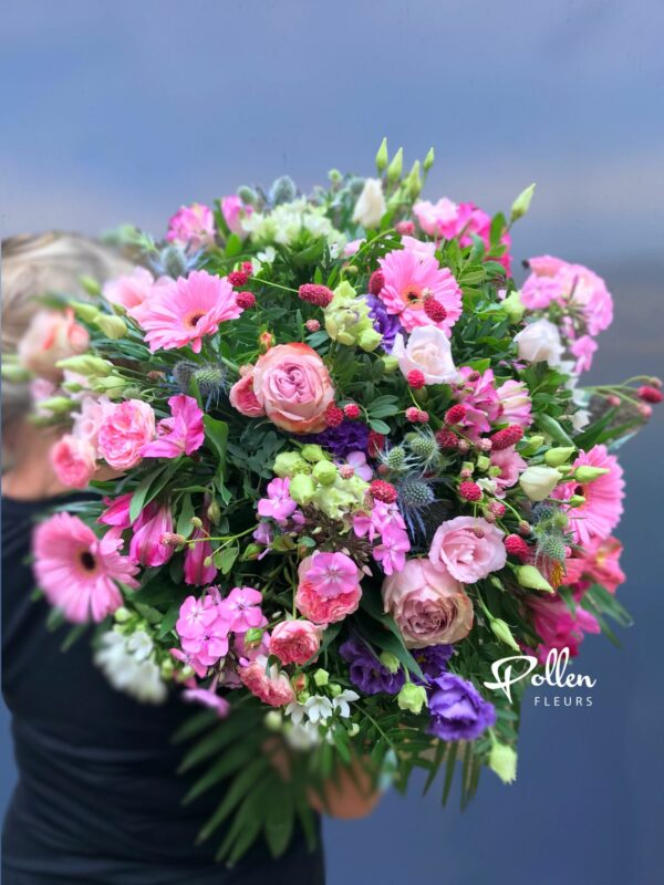 Grand bouquet champêtre aux teintes roses et parmes, parfaitement à toutes les occasions où l’on souhaite marquer les esprits avec tendresse et raffinement.