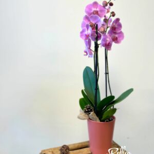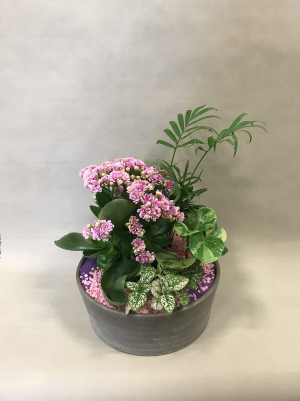 Coupe de plantes vertes et fleuries teinte rose mises en scène dans une coupe céramique.