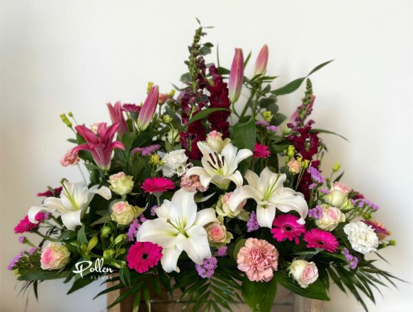 Composition de deuil uniface, piquée et hydratée, alliant volume et hauteur, réalisée en tons blancs, roses et parmes avec des roses, lys et fleurs de saison, pour fleurir la cérémonie avec élégance.