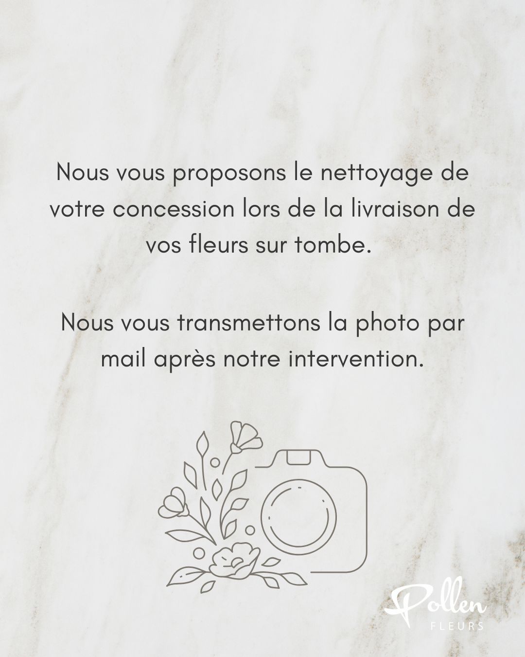 Lors de notre intervention de fleurissement sur votre sépulture, nous vous proposons le nettoyage de votre concession et vous transmettons la photo par mail une fois le nettoyage effectué.