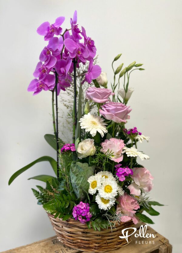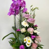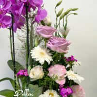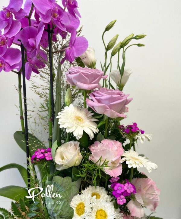Elégante composition florale parme, rose et blanche avec orchidée en pot et fleurs fraîches piquées et hydratées dans un contenant en longueur, travaillée en hauteur.