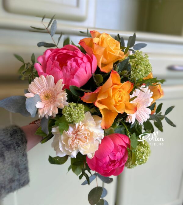 Bouquet de printemps aux teintes multicolores composé de pivoines, roses et fleurs de saison. Un bouquet lumineux et chaleureux.