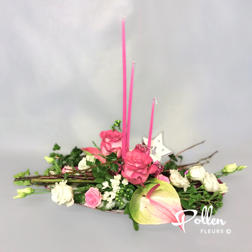 Dans un style naturel, tons roses et blancs, avec roses et fleurs de saison, branchages et décors de fêtes.