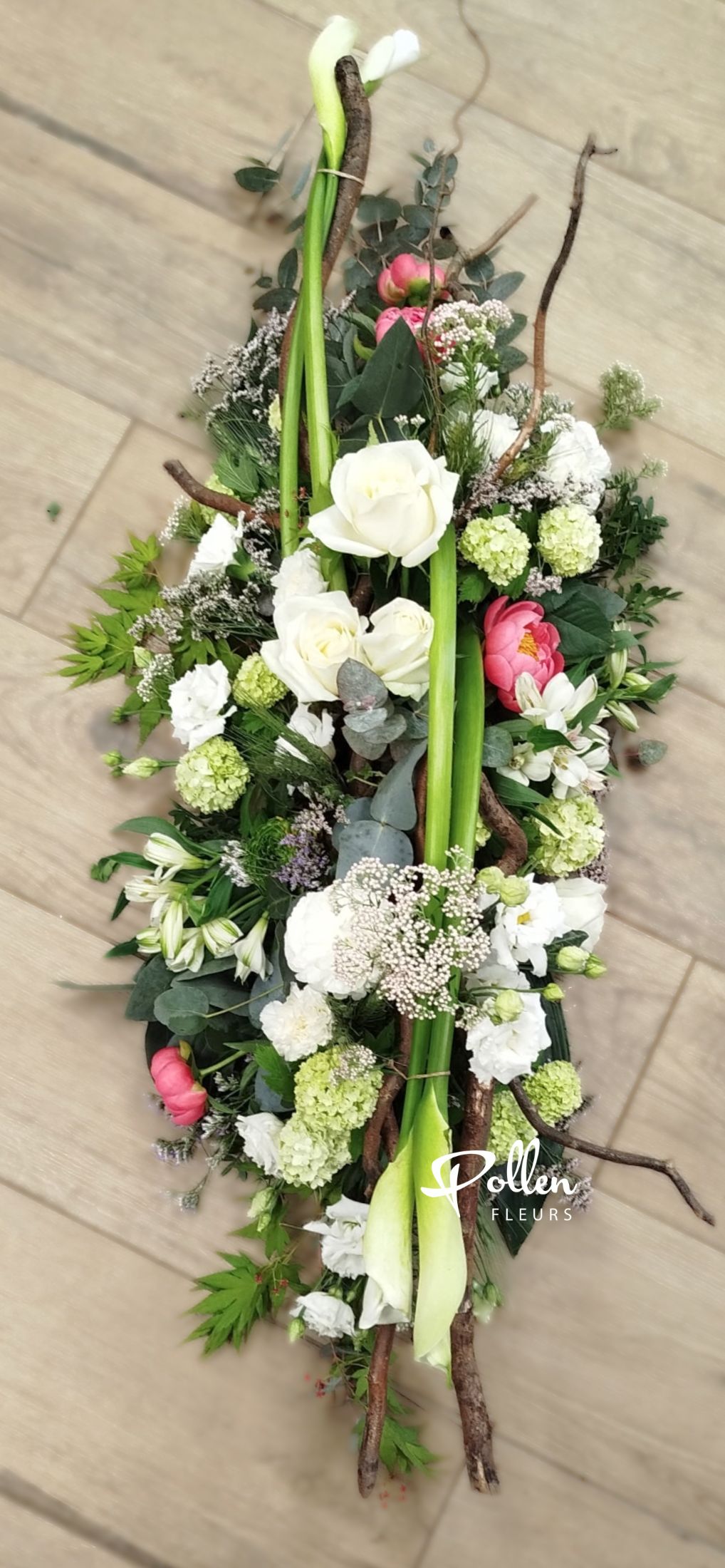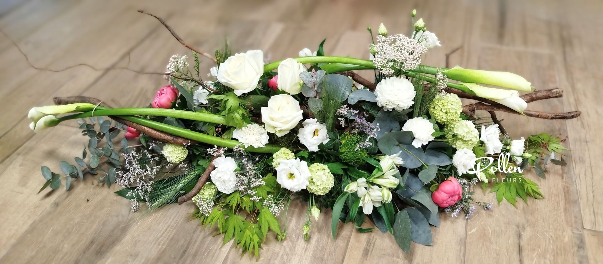 Dernier hommage empreint de nature avec ce dessus de cercueil au style végétatif et teintes blanches, vertes accompagnées d’une touche de rose qui se compose de roses, fleurs de saison et branchages. Cette composition florale en longueur, piquée et hydratée, est conçue pour fleurir le cercueil avec élégance.