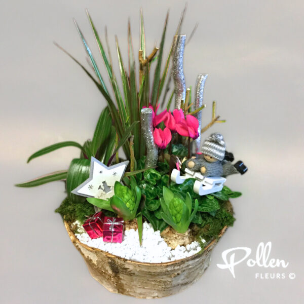 Ce jardin de plantes de saison réunit jacinthes cultivées localement et plantes vertes et fleuries aux teintes roses, présentées avec leur décor de fête.