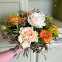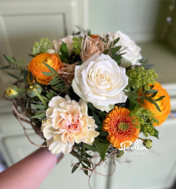 Ce bouquet avec sa structure en forme de nid mêle roses et fleurs de saison aux teintes tendres et lumineuses, pour célébrer l’esprit joyeux et printanier de Pâques.