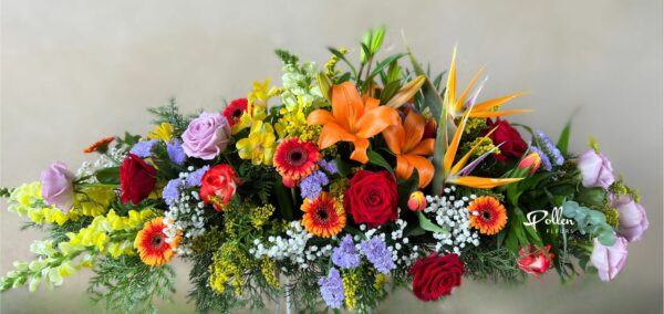 Dernier hommage empreint de couleurs avec ce dessus de cercueil aux teintes multicolores chatoyantes. Cette composition florale en longueur est piquée et hydratée.