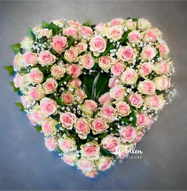 Honorez la mémoire du défunt avec ce grand coeur de roses. Élaborée avec des roses roses soigneusement piqués et hydratés, cette création florale apportera une touche de tendresse à la cérémonie funéraire.