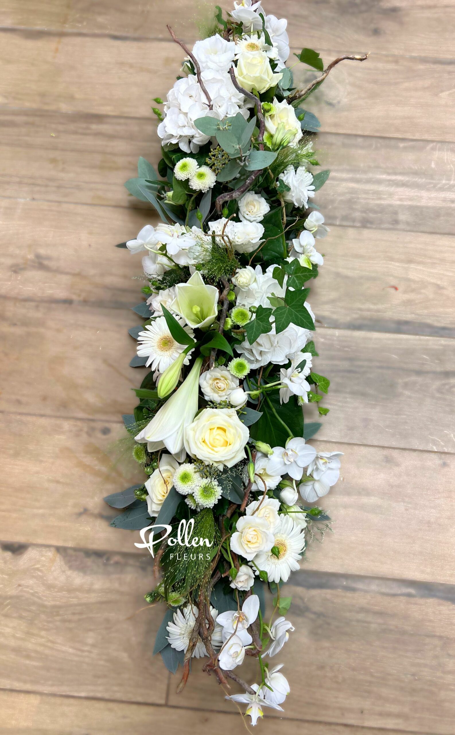 Dernier hommage empreint de nature avec ce dessus de cercueil au style végétatif et teintes blanches et vertes qui se compose de roses, fleurons d’orchidée, fleurs de saison et branchages. Cette composition florale en longueur, piquée et hydratée, est conçue pour fleurir le cercueil avec élégance.