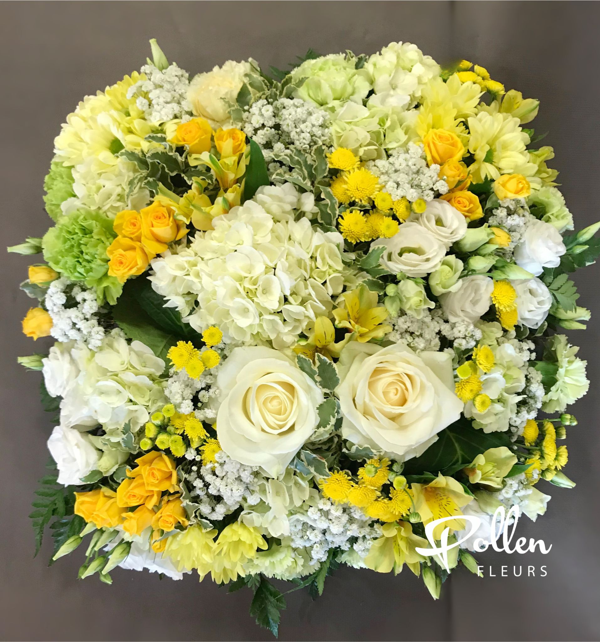 Composition moderne, de forme carré, travaillée tout en finesse. Ce coussin carré se compose de roses et fleurs de saison aux teintes jaunes, blanches et vertes.