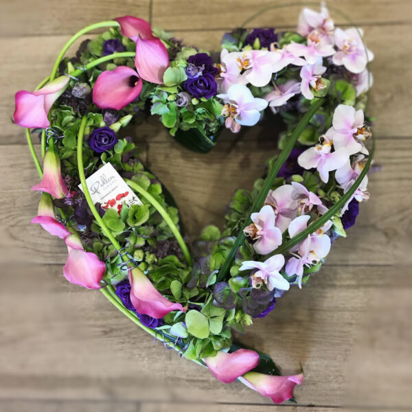 Composition moderne de deuil piquée et hydratée en forme de coeur aux teintes roses et parmes et vertes, composée de fleurons d’orchidée et fleurs de saison.