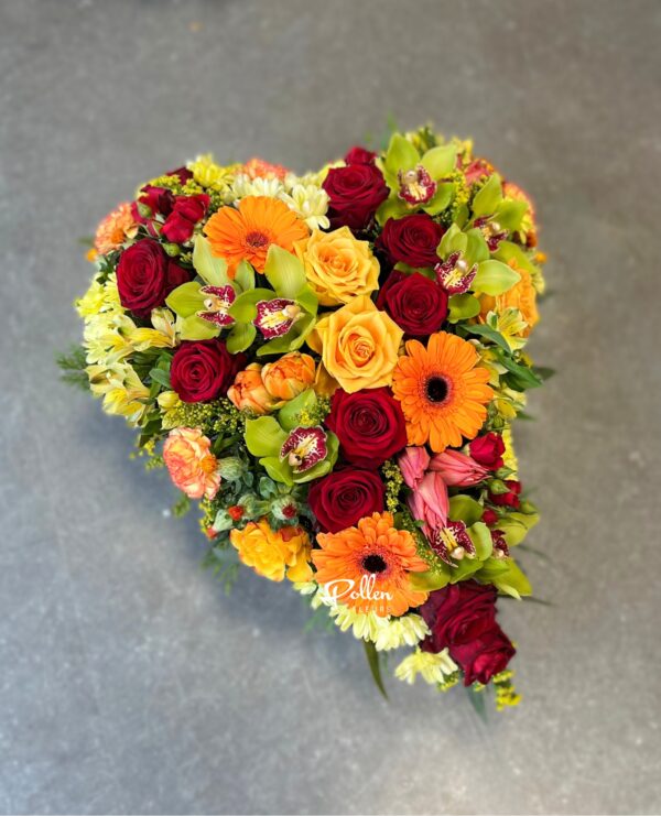 Tendre composition de deuil piquée et hydratée en forme de coeur composée de roses et fleurs de saison aux teintes colorées, orangées, rouges et jaunes