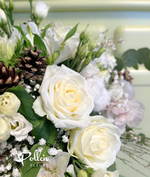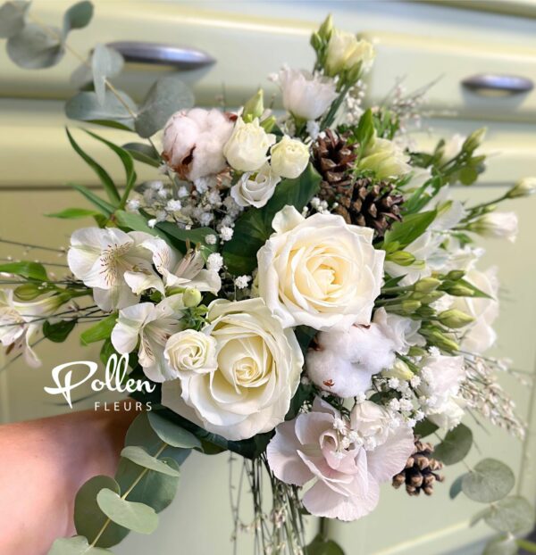 Élégant bouquet hivernal aux teintes blanches composé de roses et fleurs de saison accompagnées de leur décor hivernal avec fleurs de coton et pommes de pin. Un bouquet tout en douceur et légèreté.