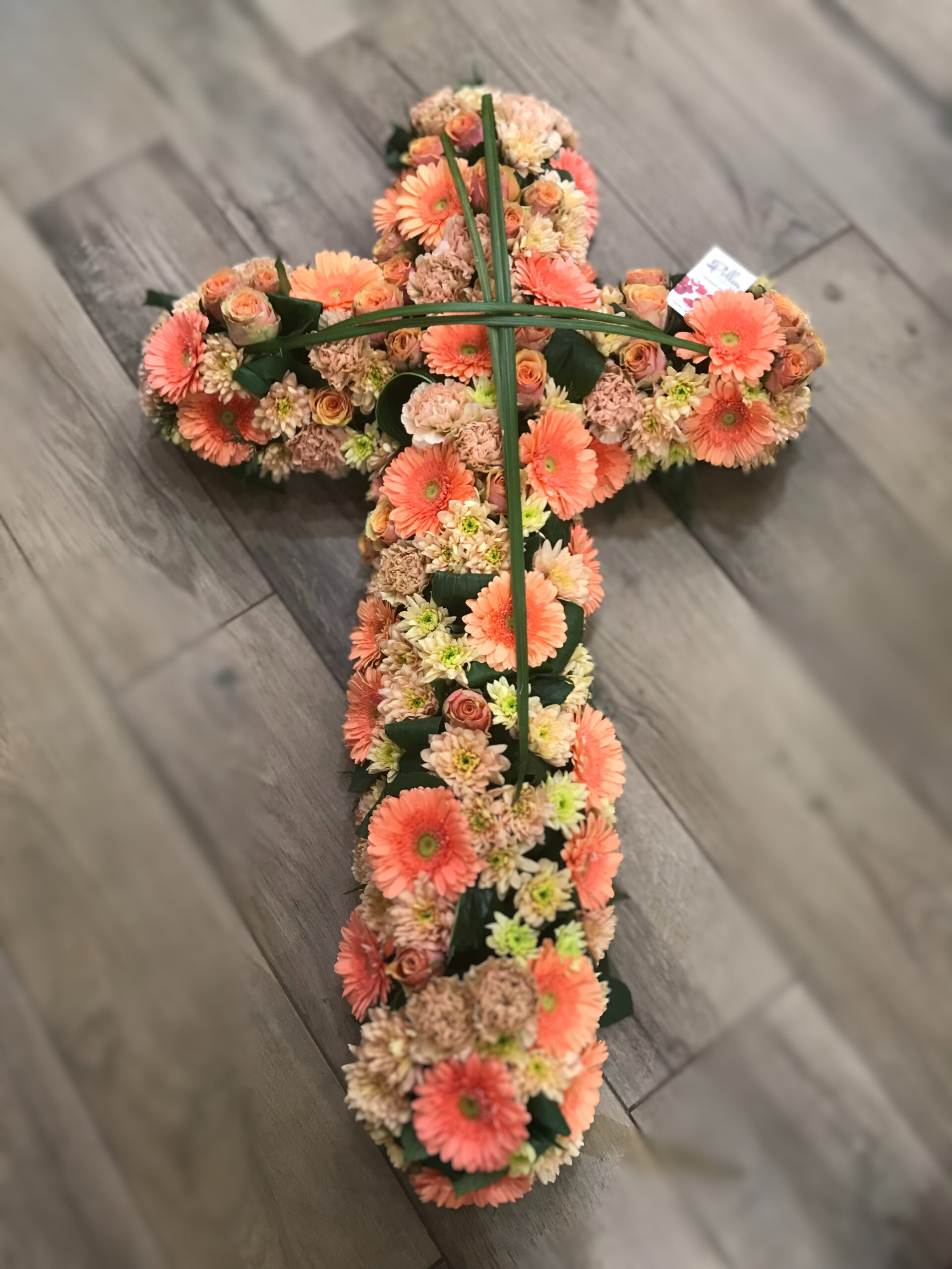 Composition de deuil en forme de croix à déposer sur le cercueil. Roses et fleurs de saison piquées et hydratées.
