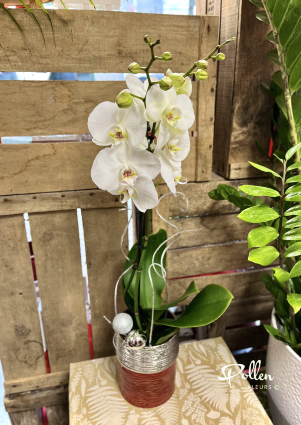 Elégante et intemporelle orchidée phalaenopsis blanche à deux branches, vendue avec son cache-pot et son décor de fête.
