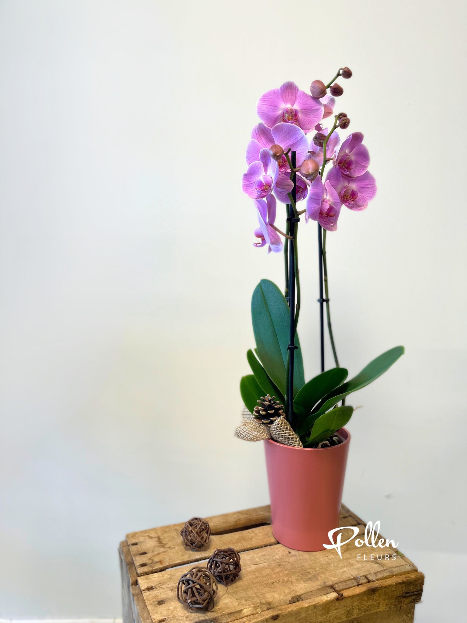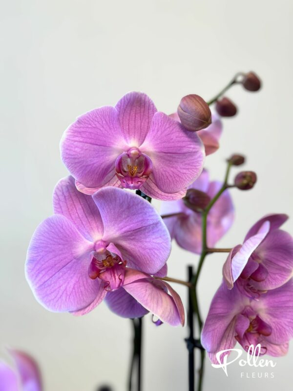 Elégante et intemporelle orchidée phalaenopsis rose à deux branches, vendue avec son cache-pot.