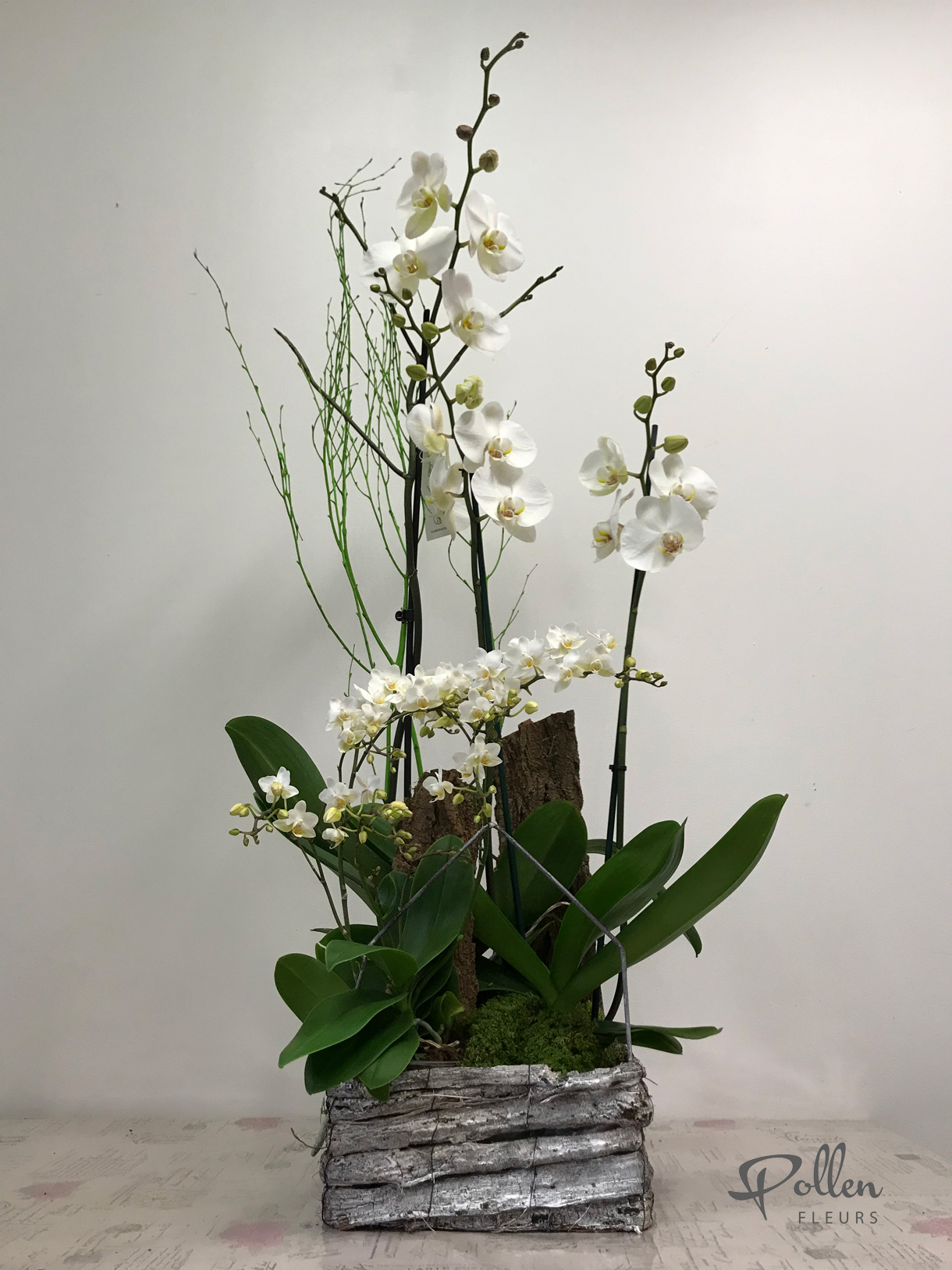 Elégante et intemporelle composition garnie de plusieurs pieds d’orchidées phalaenopsis blancs dans son contenant et décor naturel.