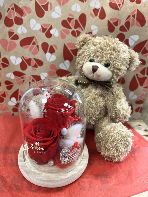 Composition de roses éternelles et fleurs séchées 100 % naturelles présentées dans une cloche en verre.