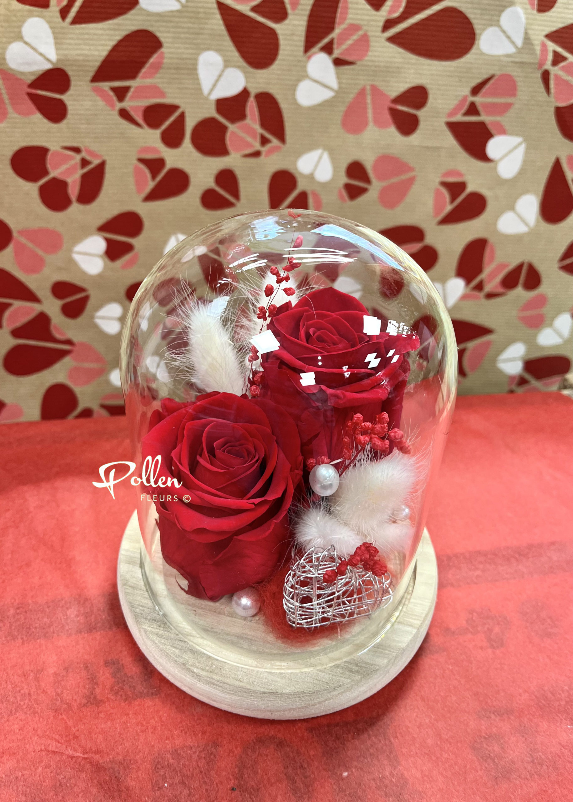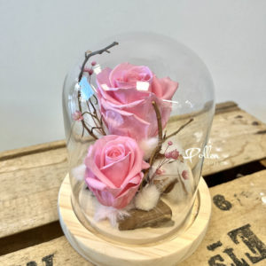 Composition de roses éternelles et fleurs séchées 100 % naturelles présentées dans une cloche en verre.