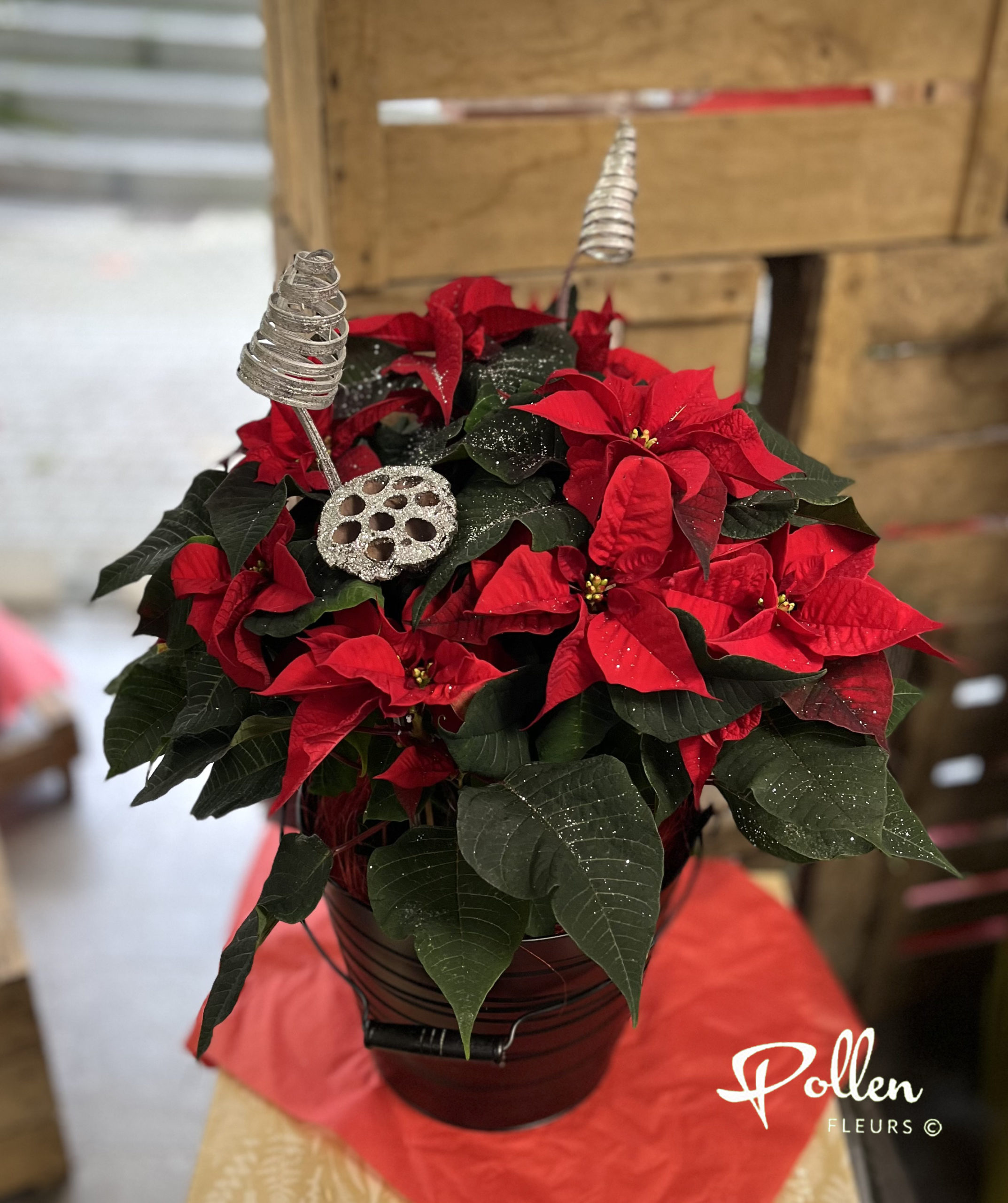 Plante d’intérieur aux couleurs chatoyantes, présentée avec son cache pot et décors de fêtes.