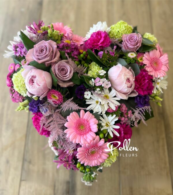 Tendre composition de deuil piquée et hydratée en forme de coeur composée de roses et fleurs de saison aux teintes roses, parmes, blanches et vertes.