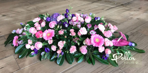Elégante composition de deuil de forme allongée piquée et hydratée composée de roses et fleurs de saisons.