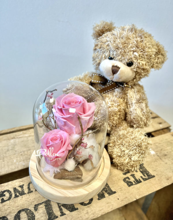 Roses éternelles accompagnées de leur nounours.