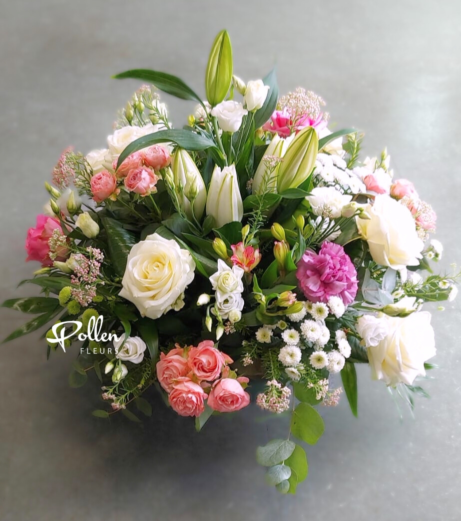 Ce coussin rond de deuil, composé de roses, lys et fleurs de saison piquées et hydratées aux tons blancs et roses, offre un hommage élégant et raffiné en mémoire du défunt.