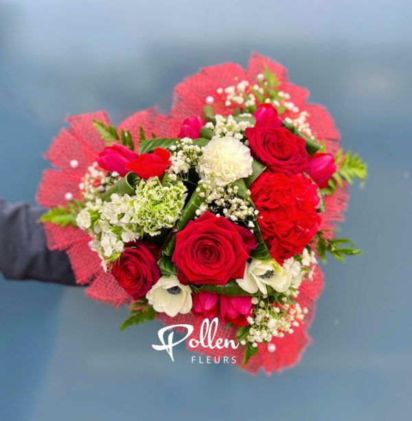 Exprimez votre amour avec notre magnifique bouquet structuré en forme de cœur, spécialement conçu pour exprimer votre amour. Composé de roses rouges passionnées et de fleurs de saison soigneusement sélectionnées, ce bouquet symbolise la romance et l’affection. Chaque détail de cette composition unique est pensé pour émerveiller votre bien-aimé(e) et rendre sa journée encore plus spéciale.