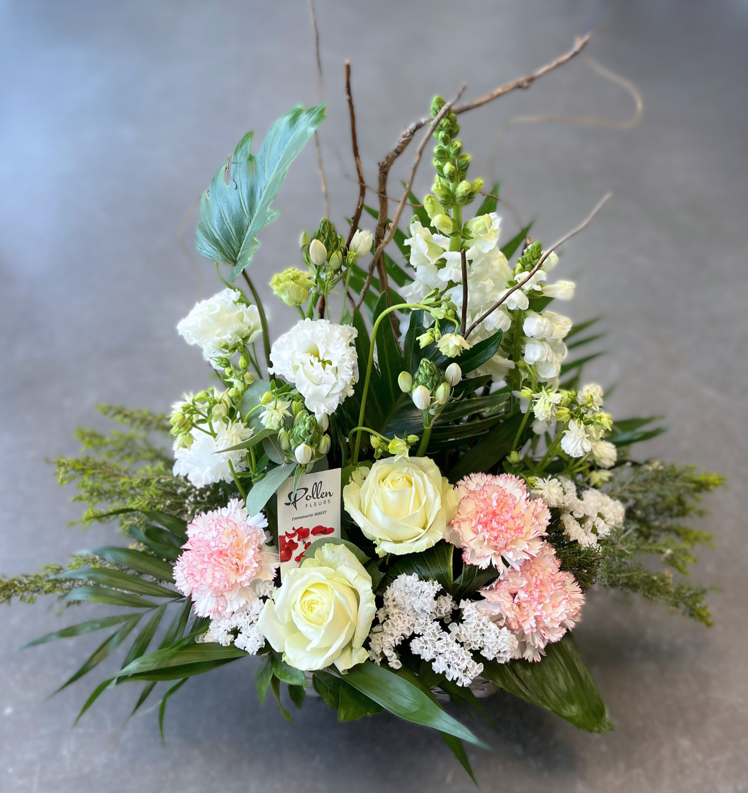 Découvrez notre composition champêtre au style naturel, composée de roses et de fleurs de saison aux tons blancs avec une touche de rose. Cet arrangement, piqué et hydraté dans un contenant, est conçu pour apporter une note de tendresse et d’élégance à tout espace.