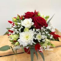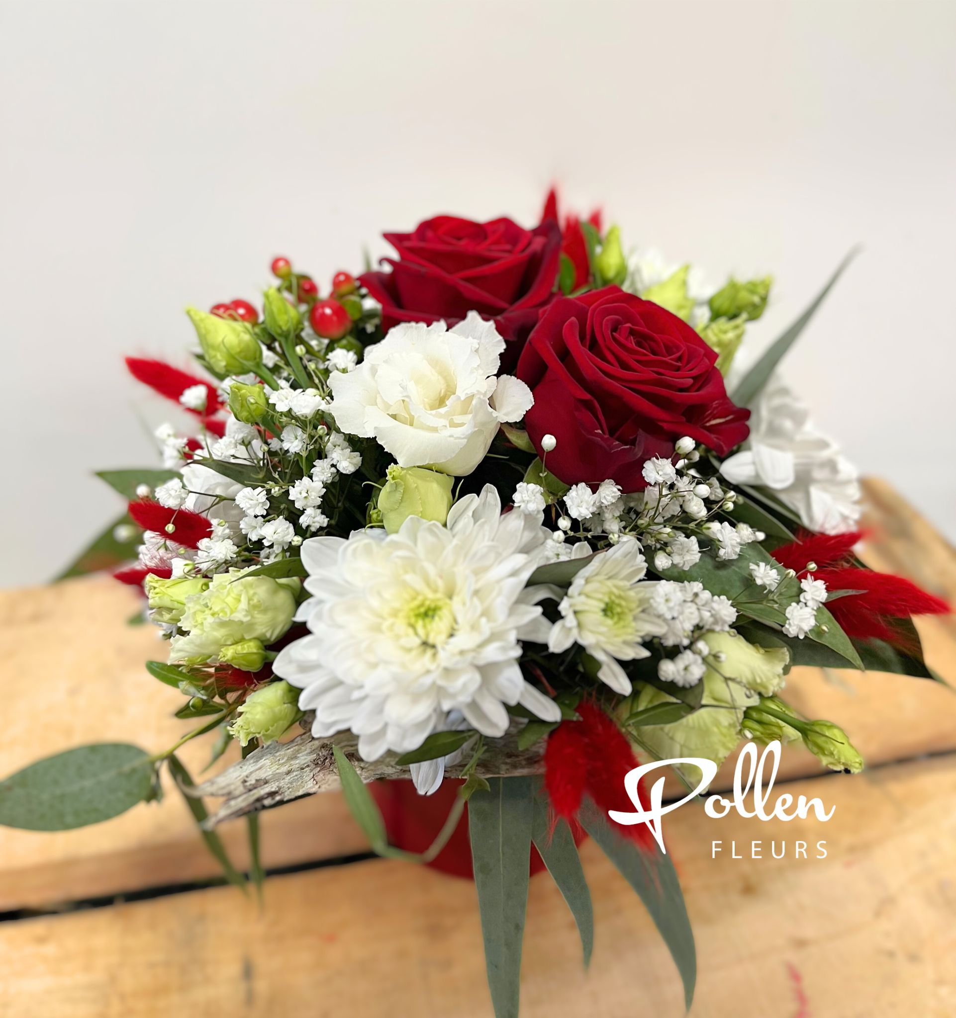 Composition ronde, piquée et hydratée de roses rouges et fleurs de saison, dans son contenant.